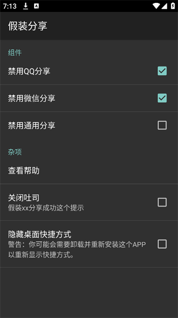 注:此模块并不能让软件认为对应的社交软件已安装,因此部分软件可能提示“请先安装xx后再分享”