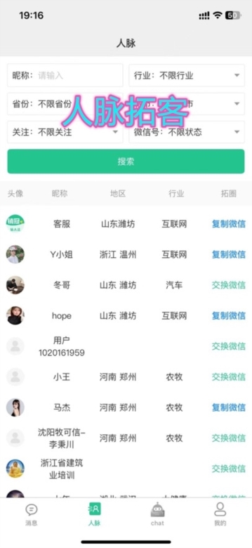 2. 智能人脉拓客:支持人脉搜索、名片交换,并无缝对接等主流即时通讯平台,助力高效拓展客户资源。