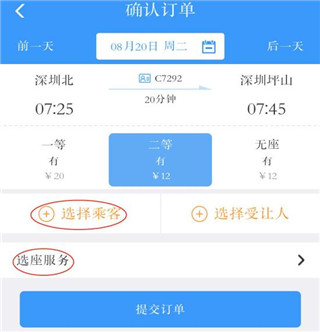 3. 选择合适车次后,点击选择乘客”,确认乘车人信息并提交订单。