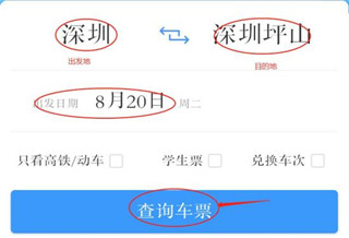 2. 在首页输入出发地、目的地和出发日期,点击查询车票”。