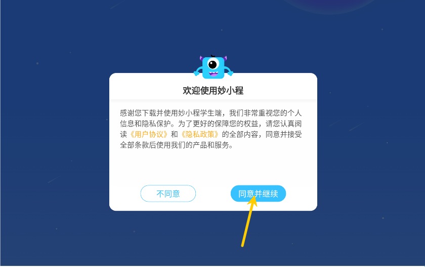 1、在本站下载妙小程学生端APP,点击“同意并继续”。