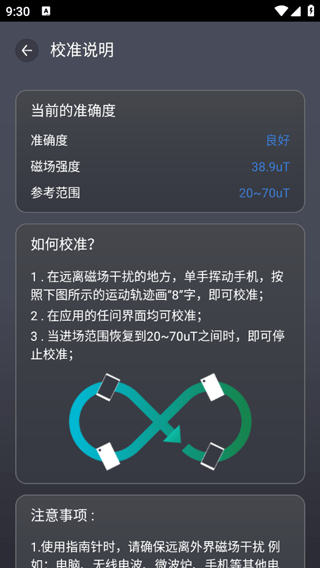 1、选择一个远离磁场干扰的空旷环境,单手平举手机,按轨迹画出8”字形动作完成传感器校正。