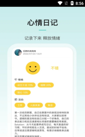 是个人情绪日记,无论是晴天还是雨天,陪你感受生命的点滴,也是你的灵魂探索伴侣,帮助你了解自己的内心世界。你可以遇到其他的小伙伴,他们决心在你的一生中成长,和你一起变成更好的自己。