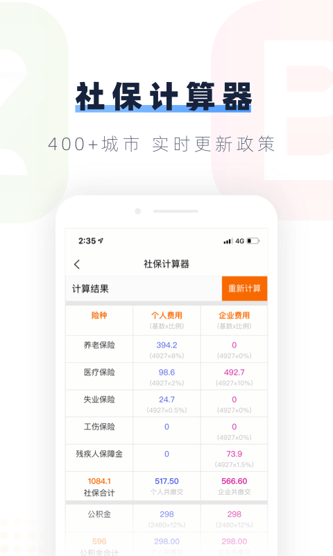 支持全国400个+城市,实时更新基数和缴交政策,轻松计算应缴社保和公积金.