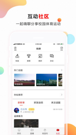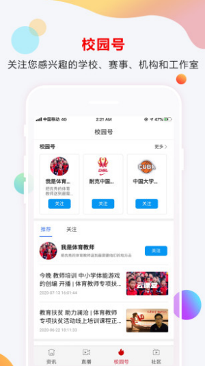 菁体育app是一款为学校师生搭建的运动健身平台,菁体育app上为大家提供校园体育资讯、赛事直播、课程培训等诸多功能,能够培养大家的健身意识和热情,还能找到各种体育活动专区找到好友一起运动,需要的用户不要错过!