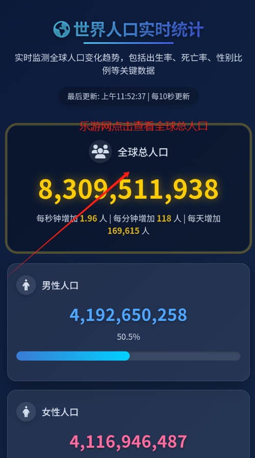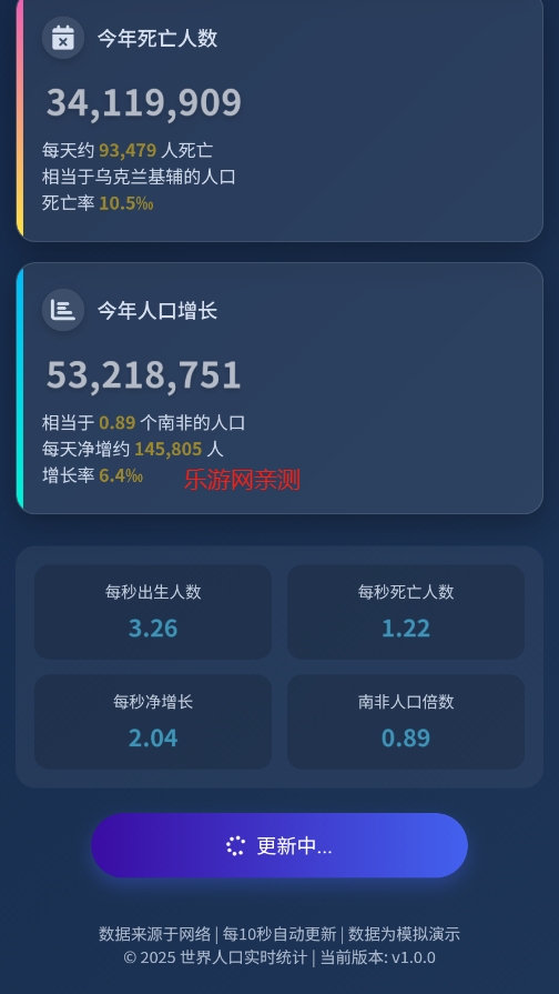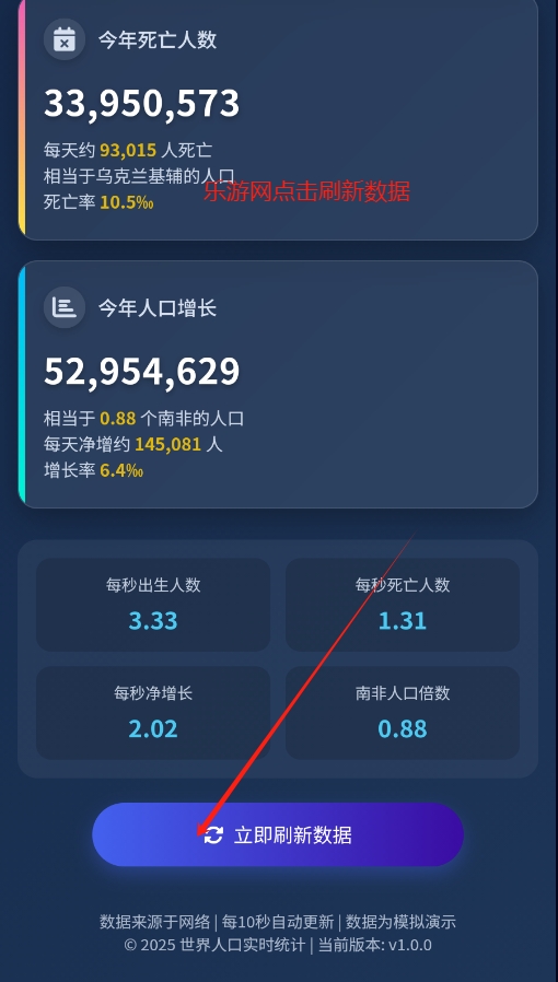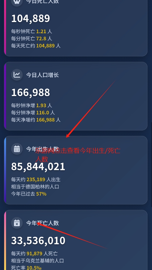 实时显示每秒出生/死亡人数(如+2.3人/秒),将抽象人口变化转化为具象数值,增强认知沉浸感。