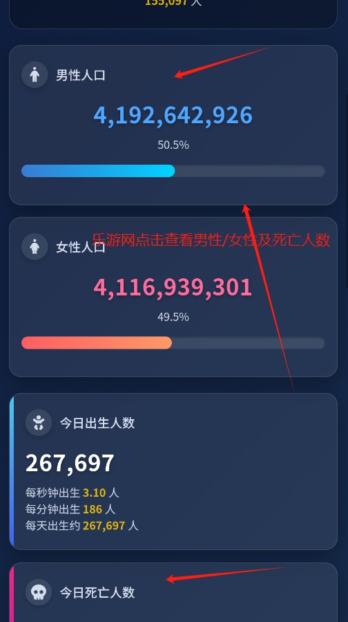 2、可以查看男女人口比例,今日出生,死亡人数及增长数。