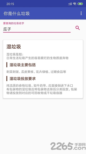 你是什么垃圾app是一款超棒的垃圾分类工具。完美的帮你进行各种垃圾分类,轻松搜索就能了解各种物品属于什么类别!丰富的知识轻松科普!你还在等什么?快来2265安卓网下载吧!