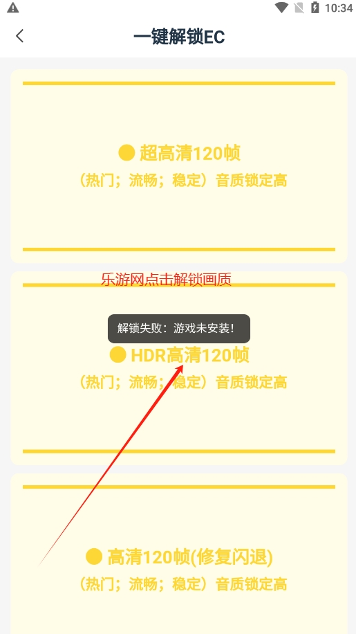 3、点击画质解锁后发现提示的是游戏未安装,由此可知,该应用是无需卡密的版本,所以不存在卡密获取这一说法的。
