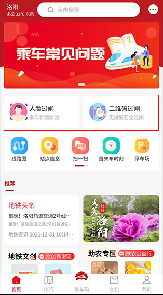 1、下载并打开洛阳地铁App(洛易行),在首页点击【人脸过闸】或【二维码过闸】。
