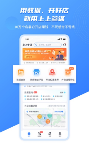 上上参谋选址app是一款可以快速定位开店的选店助手。它报告一对一的专业计划,发现店址为创业项目,投资和打开商店通过加入连锁品牌,并使用人工智能大数据给你们交通和商业银行周围的地图,一个好的选址是成功开店的开始,快来下载使用吧!
