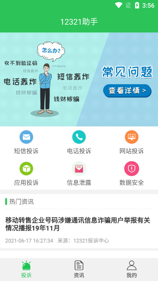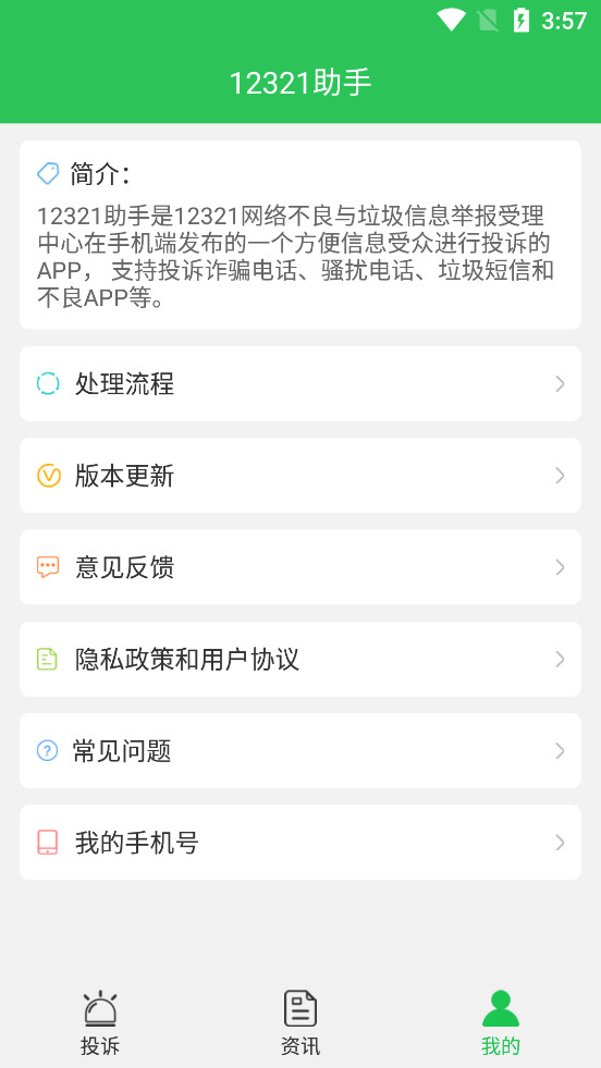 《12321助手app》是一款网络垃圾信息举报平台,有着短信投诉、电话投诉、网站投诉、应用投诉、信息泄露投诉、数据安全投诉等各种不同的投诉,帮助移动互联网用户更加便捷地举报各类网络不良与垃圾信息,净化网络环境,保护网民权益。