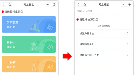 根据实际情况选择【幼升小】或【小升初】,并勾选生源类别(如城区户籍、购房家庭、随迁子女等)。