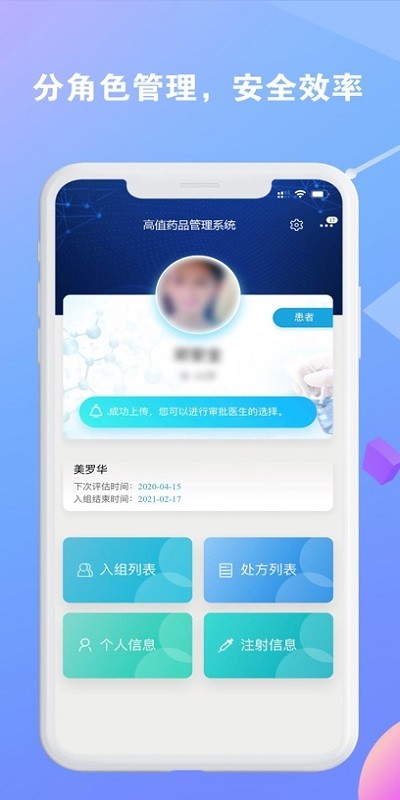 徐州高值药品管理app手机版能够进行高值药品的管理,针对徐州地区用户,更好的服务于广大患者,支持在线进行特药待遇申请,查询特药待遇评估结果,有详细的注射信息,在线即可对处方进行核销。