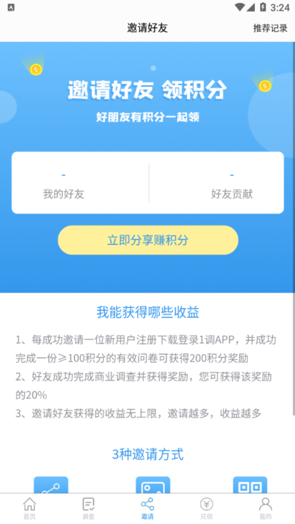 一调网app首页有商业调查、每日签到、幸运抽奖、积分兑换等,还有账户积分、信用值,在邀请界面,用户还可以根据要求获得收益,包括邀请新用户,比如通过链接邀请、通过海报邀请、面对面邀请,在我的界面还有我的账号、个人资料、账号信息等。