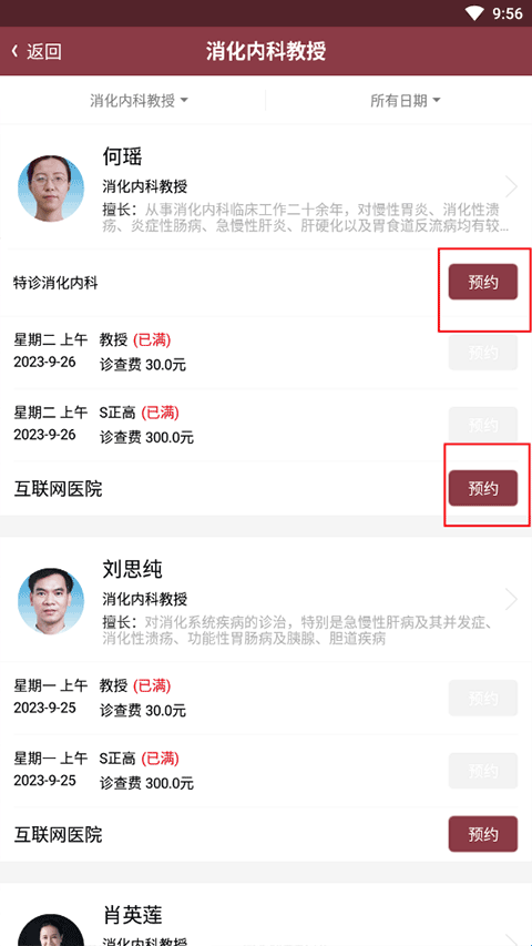 4、选择问诊医生,点击“预约”即可。注意:显示已满的无法进行挂号!