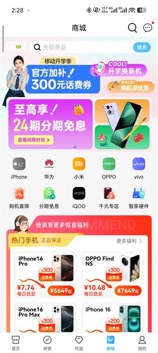 4、商城:提供多元化的购物涵盖手机、智家硬件等各种类型,更有官方加补300元话费卷