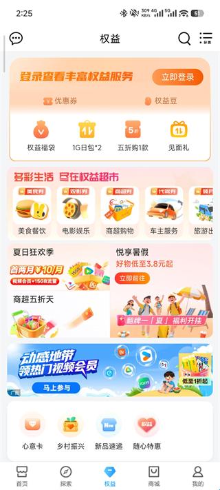 3、权益:多彩生活尽在权益超市,吃喝玩乐住行权益会员,月月可领,一切尽在掌中!