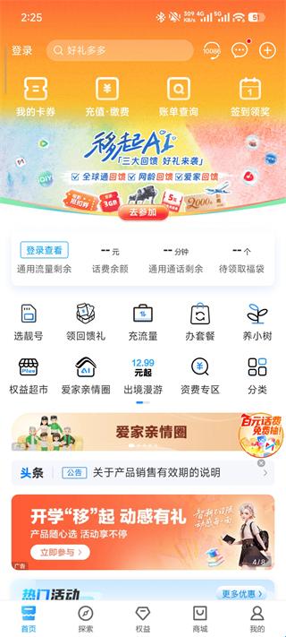 1、通信+生活:首页集充值·缴费、账单查询、爱家亲情圈、出境漫游等一站式功能板块体验食住行娱