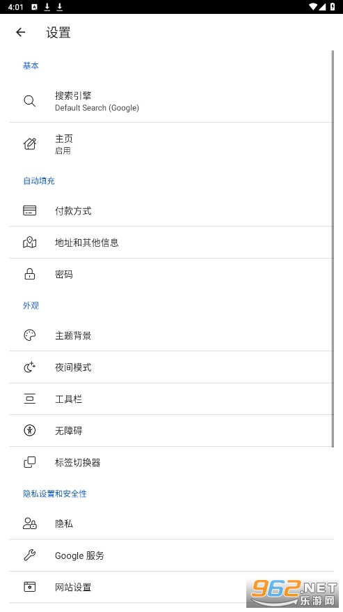 7、在设置里还可以修改搜索引擎、主页、支付功能、外观界面等选项。