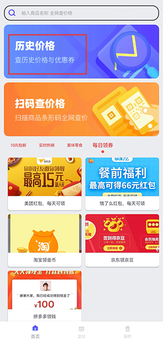 1、搜索商品名称,查询各大电商实时价格、优惠券、历史价格。