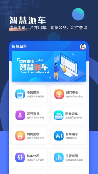 智慧派车是一个车队智能管理软件,应用程序提供各种车辆服务,包括汽车维修、汽车维修、车辆年度检查、汽车保险等,任意选择分类查看相应的服务介绍,无论是需要派车还是申请用车一键申请都非常方便,大大简化了用车流程。