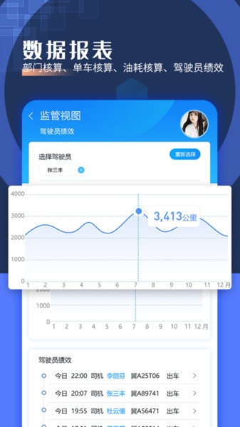 监管视图:在手机上随时查看用车记录,具有部门核算、单车核算、油耗核算、行驶公里数、驾驶员绩效考核等报表,为管理者提供更多的数据决策依据,合理派车、用车,且符合巡视及稽核检查的各项规范要求。