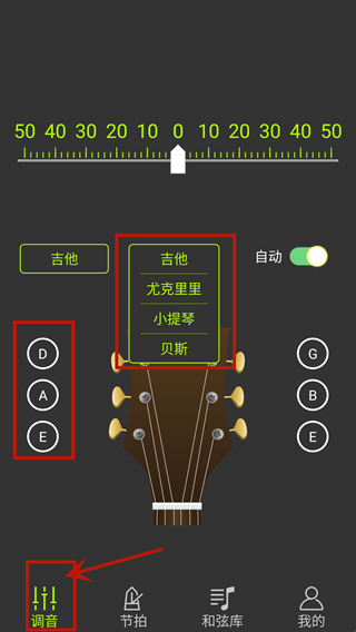 3、在调音界面可以切换不同的乐器,点击不同的和弦即可开始调试。