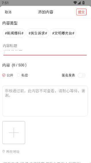 4、输入爆料内容,并上传相关图片,确认无误后点击【发布】,即可完成爆料提交。