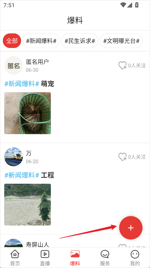 2、进入爆料页面后,点击右下角的【+】按钮开始发布内容;
