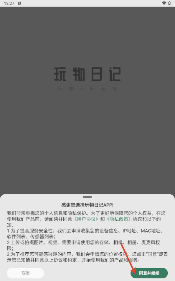 1、在本站下载玩物日记APP,阅读隐私协议,点击“同意并继续”