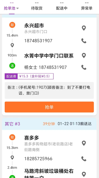 1、多平台订单聚合:支持接入主流本地生活平台(如美团、饿了么、京东到家、叮咚买菜等)的合规开放接口,在一个App内统一接收、管理和完成各类配送任务,避免频繁切换应用。