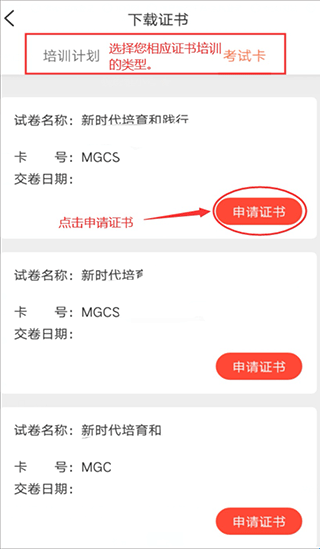 2、选择您相应培训的类型,在您培训计划学习完毕且考试通过,或考试卡考试合格后,在此页面下方会出现“申请证书”按钮,点击“申请证书”即可;