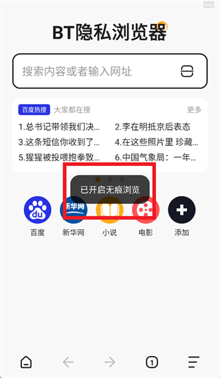 3、BT隐私浏览器app即可开启无痕模式。