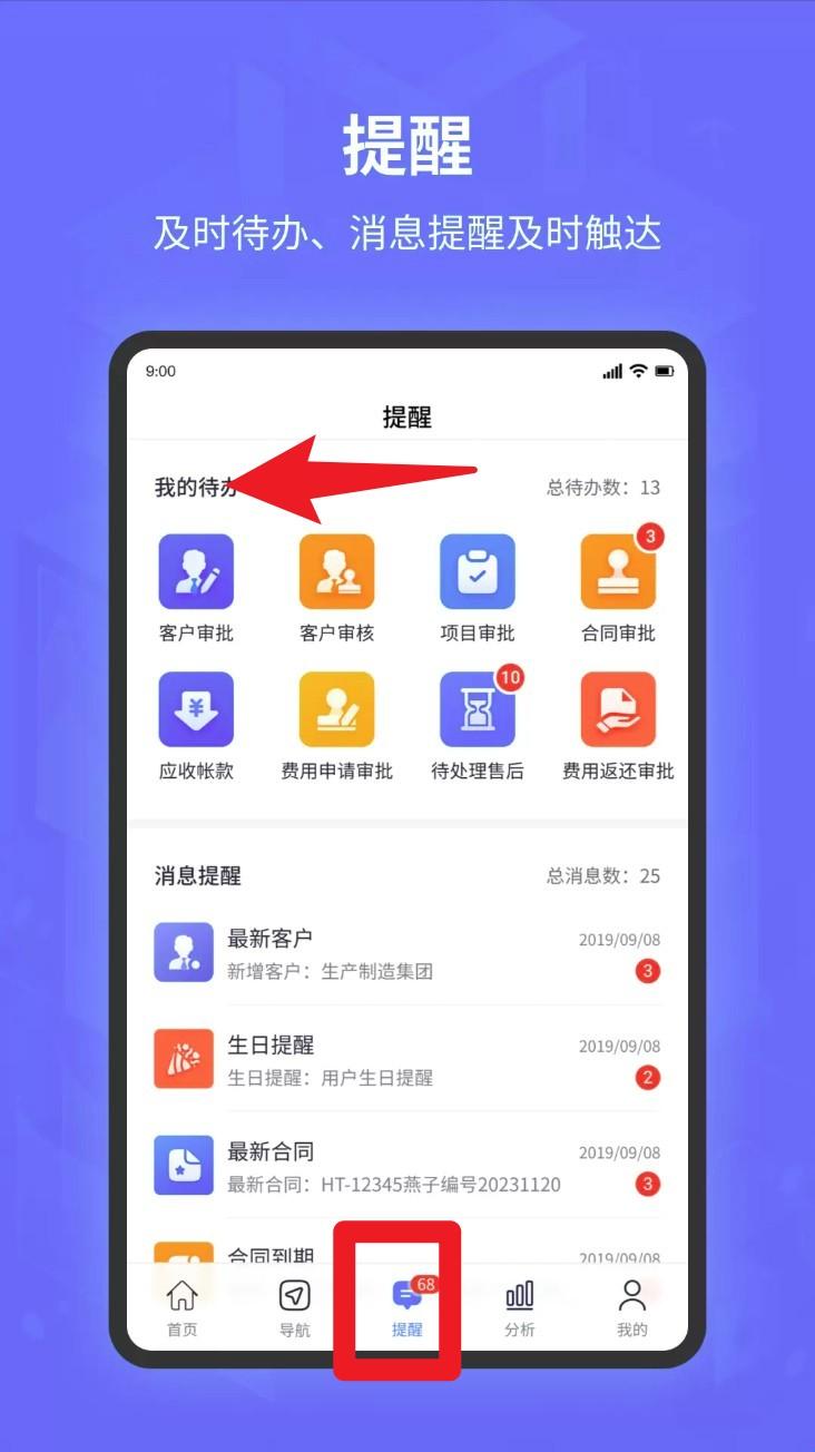 4、切换至「提醒」页签,可查看待办事项列表及各类消息提醒,支持快速处理审批流程。