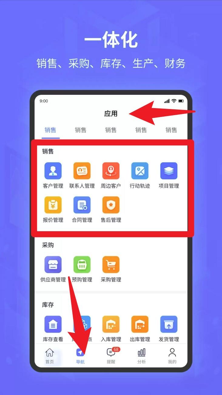 3、点击底部导航栏「导航」,可进入应用中心,使用销售、采购、库存、生产等各类模块。