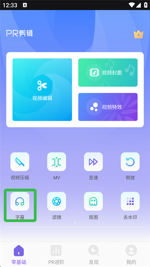 1、进入PR教学app,点击【字幕】,上传需要操作的视频。