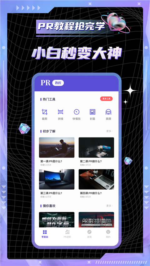 PR教学帮助用户成为具备一定剪辑水平的软件,提供视频剪辑、封面制作、抠图等剪辑操作,里面的剪辑功能比较全面,可以满足各种用户的需求,用户在编辑之后保存之前预览一遍,可以修改。如果你不会剪辑没有关系,可以在APP里面学习详细的教程,各种新奇的剪辑方式可以学习,让你的剪辑作品炫霸朋友圈,有需要的用户可以下载试试看!