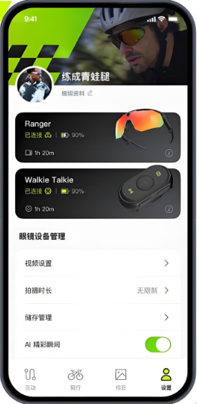 4、设置管理:根据个人的骑行智能眼镜使用需求进行配置调整,管理眼镜设备的各项使用参数;