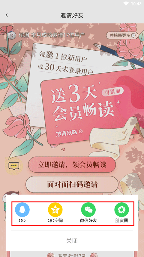 3、邀请两种方式,第一种是通过qq、等社交平台进行分享;