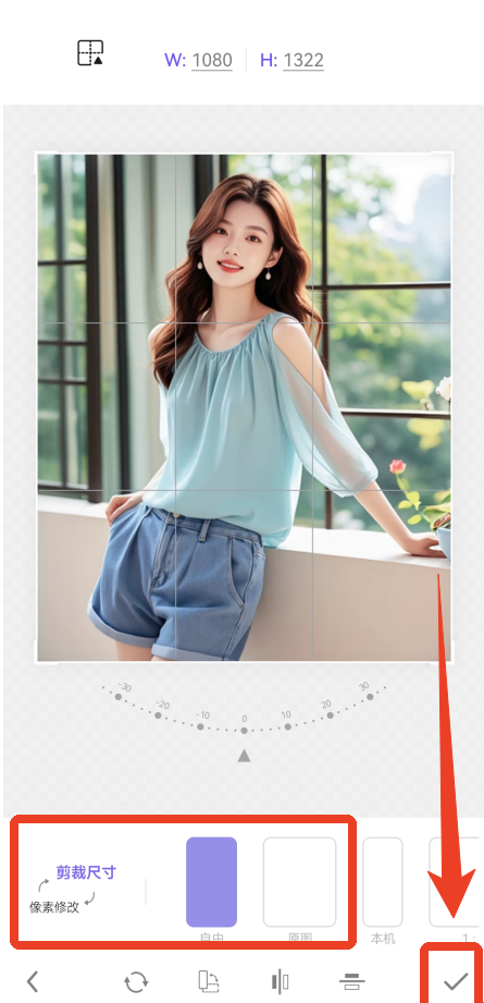 2、在相册里选择好需要抠图的照片就能开始了,首先需要选择尺寸,你可以自定义可以选择不同的比例模板,也能进行图片翻转操作,完成之后点击右下角的【√】。