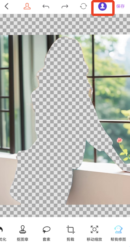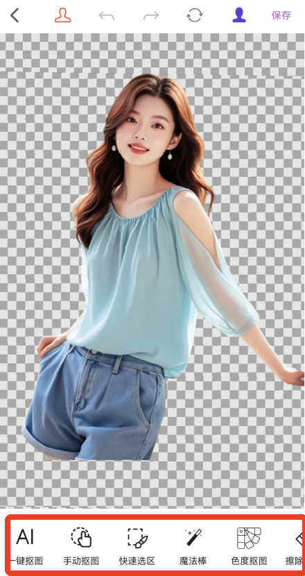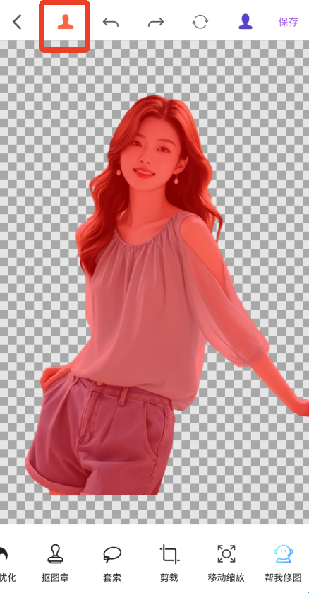 3、等待一会后就能看到已经抠好的人物图片,点击上方第一个红色人像显示的是抠出的部分,最后一个蓝色人像显示的是去除的部分,再次点击可以取消。