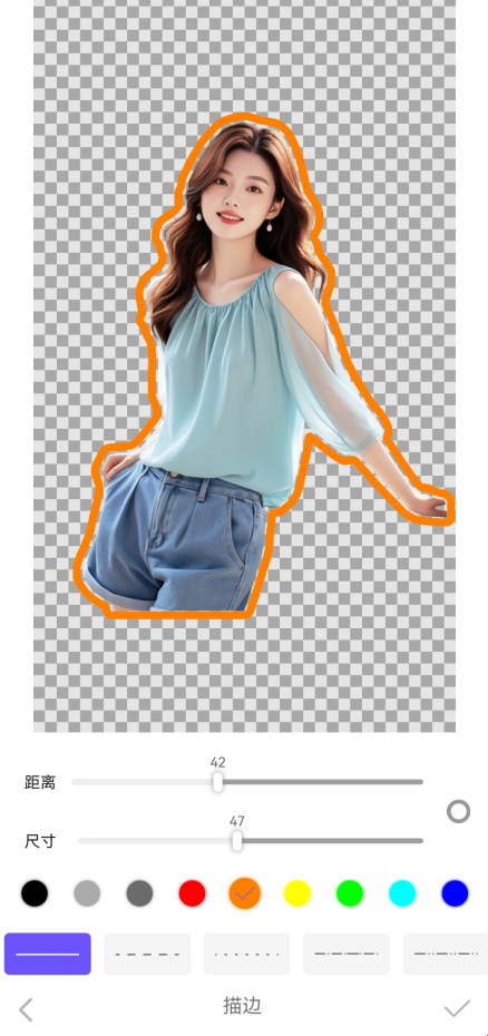 6、你可以给抠好的人物添加描边,支持设置描边的距离、粗细、颜色和样式。