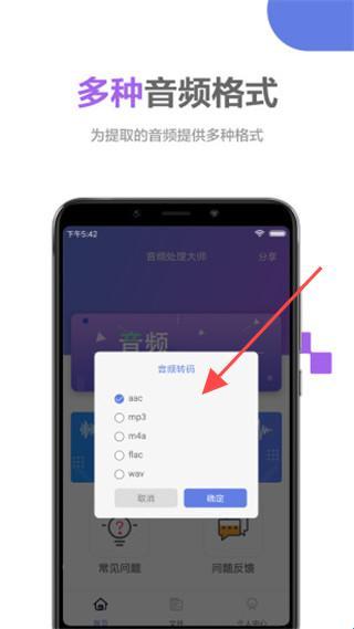 2、选择【提取音频】后可选取aac、mp3等多种格式。