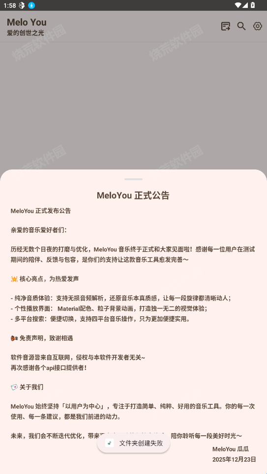 MeloYou音乐为您提供海量高音质歌曲资源!即点即听,内容都是随机的,遇到喜欢的音乐可以直接收藏起来,还可以创建专属音乐歌单,随时免费畅听!软件内所有音乐都是完全免费的,还可以一键导入音频,功能齐全,喜欢听歌的千万不要错过了!