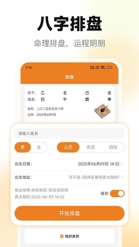 根据排盘需求,自行输入基础性、选择公历或阳历以及性别等即可智能排盘;
