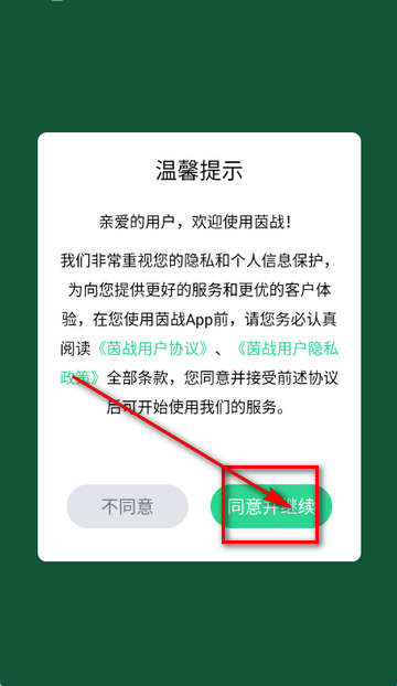 1、打开茵战app,点击同意隐私政策。