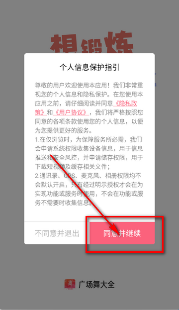 1、打开广场舞教学大全app,点击同意隐私政策。