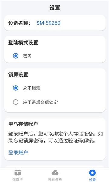甲马存储app是一款界面简洁,使用方便的云存储软件,提供了保密柜,让你可以知道手机内存和分类管理,同时还提供了私有云盘,支持文件存储,文件备份等操作,需要注册登录,更加安全,可控。