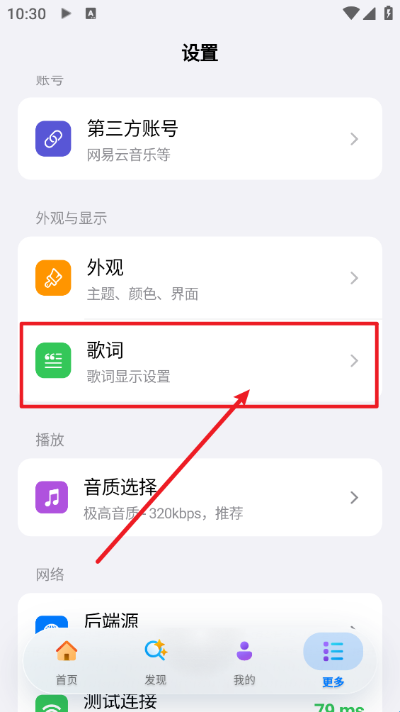 3、来到设置界面,找到歌词设置并点击。